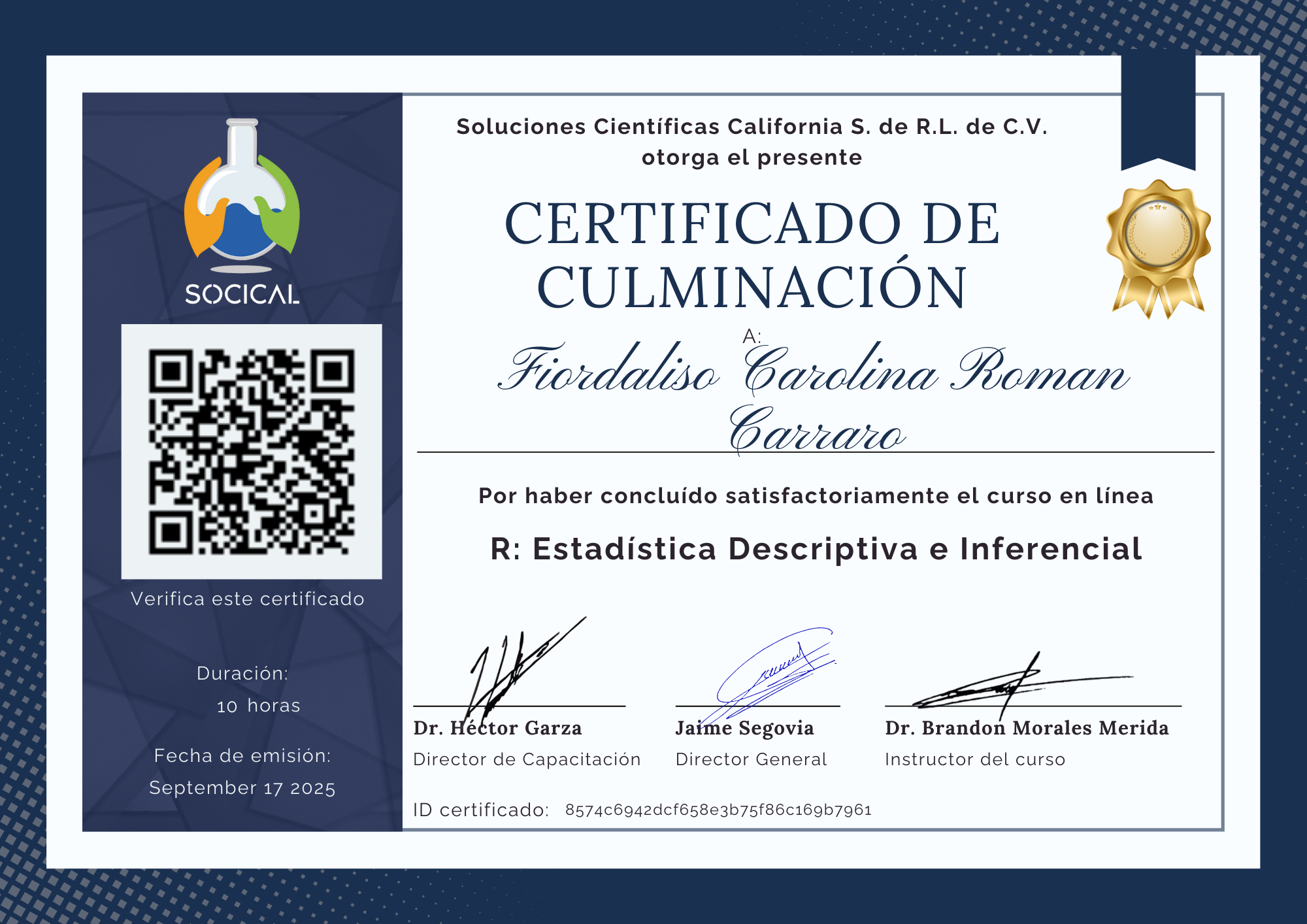 Este es un certificado verificado por Soluciones Científicas California S de RL de CV