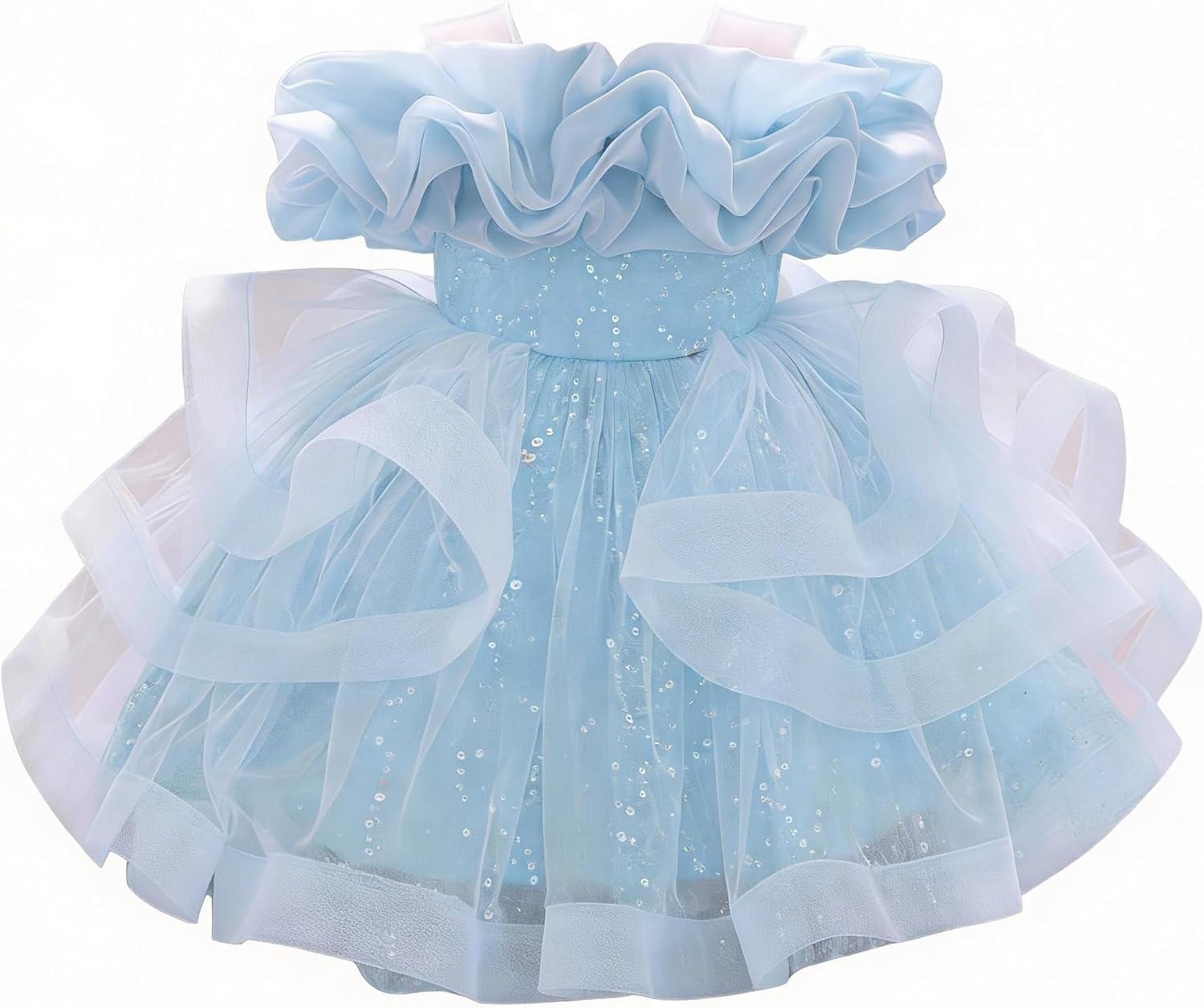 Make your little princess the belle of the ball with this stunning red fluffy evening gown for baby girls. This exquisite dress features a luxurious design with multiple layers of soft tulle fabric adorned with delicate sequins that catch the light with every movement. The standout ruffled neckline creates a dramatic, elegant look, while the fitted waist with a beautiful bow accent adds a perfect finishing touch. Crafted from 65% Polyester, 35%Viscose, this A-line dress offers both comfort and style for special occasions. The pull-on design makes dressing your little one hassle-free, while the above-knee length showcases the dress's beautiful layered construction. The rich red color makes this gown perfect for holiday parties, birthdays, photoshoots, or any celebration where your baby girl deserves to shine. Machine washable for convenient care. Available in various sizes to fit your growing toddler perfectly.