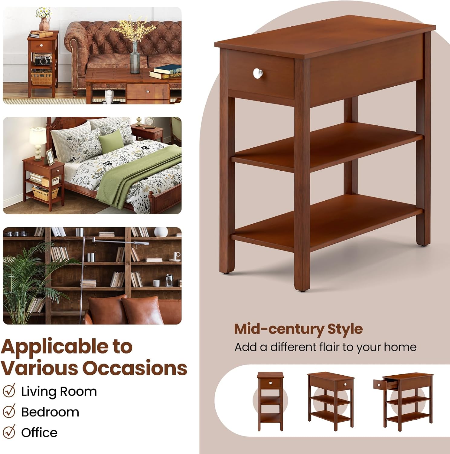 Narrow End Table Set of 2, Farmhouse Side Tables with Drawer & Storage Shelves, Wood Sofa Side Tables, 3-Tier Nightstands for Small Space, Living Room, Bedroom, 23.5"L x 12"W x 24.5"H