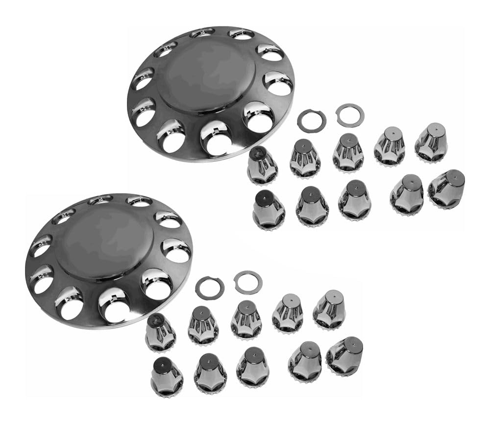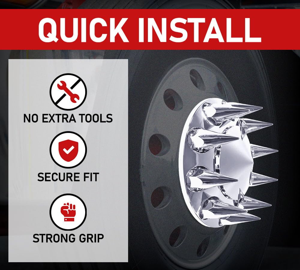 Complete Axle Cover Kit Includes(2) Front Pointed Axle Covers(4) Rear Pointed Axle Covers(6) Plastic Rim Prot(1) Reusable Installation Wrench(60) Pointed Threaded Nut CoversRobust Construction: This Axle Cover Kit assures exceptional longevity and protection against corrosion due to its construction from top-notch ABS chrome plastic, renowned for its robustness and rust-resistant properties.Aesthetic: These high-quality precision-engineered axle covers effectively hide the unattractive appearance of your axles, providing a polished and affordable solution that enhances the overall aesthetic of your vehicle.Compatibility: It offers a versatile solution that caters to the diverse needs of truck owners, ensuring efficient performance and compatibility across various truck makes and models.Cost-Effective: A reusable installation wrench is provided, which can be utilized multiple times, ensuring cost savings and increased efficiency for users across various industries.Easy Maintainance: The versatile design of these hub caps ensures that users can swiftly access the axle, simplifying the process of maintaining and repairing their vehicle with utmost convenience.Durability: The durability and resistance of these covers ensure enhanced protection against corrosion, ensuring longevity and a polished look for your truck wheels.Simple Installation:With the provided wrench, you can quickly install high-quality axle covers. First, place the axle cover in the hub's corresponding locationScrew the nut covers into the hole and secure them with the wrench.Furthermore, the center cap on the front and rear covers may be removed for access to your axles or to replace your center cap if desired by simply drawing it out and then pushing it back in.