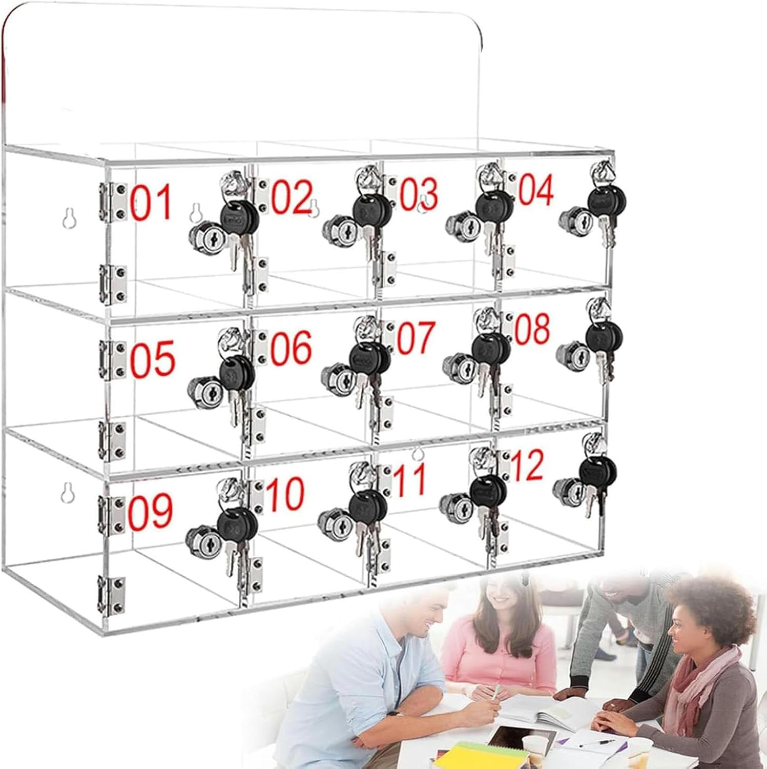 DetailsDigital Code: Each slot and each set of keys have a digital code, making it easy for you to find the corresponding slot. This can facilitate the management and storage of items.Coil: Each set of keys is equipped with a coil, which makes it easy to hang and carry the keys, thus avoiding the loss of keys.Gourd Hole: Gourd holes make the product easy to install on the wall and not easy to fall off.Steel Lock Cylinder: The lock cylinder is made of steel, which is strong, and not easily deformed. The high-quality lock cylinder makes the opening and closing of the lock more smooth.Chamfering Process: This product uses a chamfering process, which makes its edges smooth and can avoid accidental scrapes and knocks. You can use this product with peace of mind.SpecificationColor: ClearMaterial: AcrylicStyle: ModernProcess: Polishing Process, Chamfering ProcessNumbers of Slots: 6Slots,9Slots,12Slots,15Slots,20Slots,25Slots,30SlotsInstallation Method: Screw-InMounting Type: Wall Mount, Freestanding Package Included1* Clear Cell Phone Locker BoxNotesPlease allow the slight color difference caused by the shooting light and 1-3cm error due to manual measurement, and make sure you do not mind before ordering.