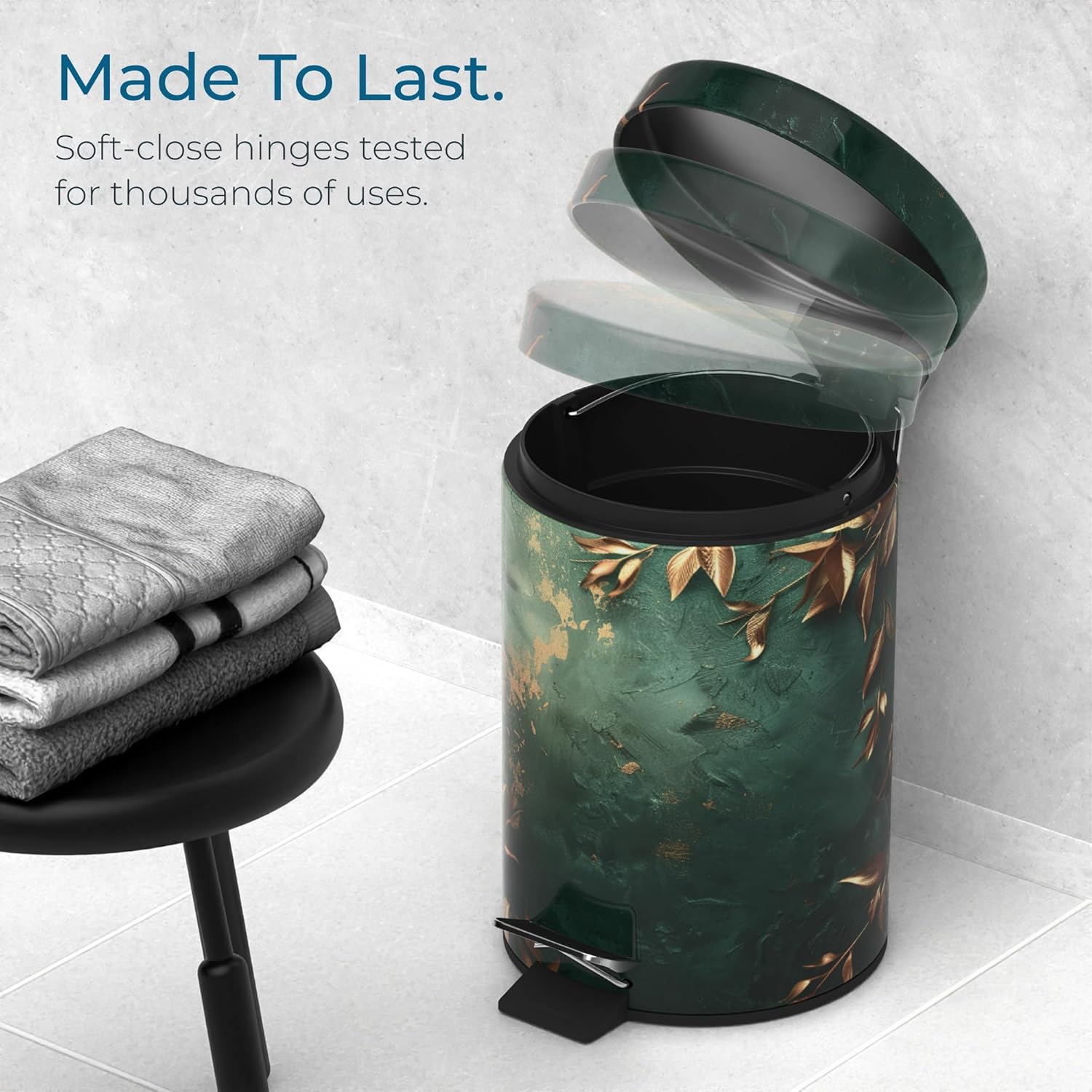 Slow Close Toilet Seat PREMIUM QUALITY: Durable molded wood construction delivers a solid, comfortable feel while resisting cracking and shifting - ideal for everyday use in busy households. QUIET SOFT-CLOSE + QUICK-RELEASE: Advanced slow-close hinges prevent slamming, while the one-click quick-release feature allows instant seat removal for fast, thorough cleaning. UNIVERSAL FIT: Adjustable hinges ranging from 18.1 to 18.9 inches ensure compatibility with most elongated toilets, allowing quick & secure installation using the included durable mounting hardware. ENHANCED COMFORT: Ergonomic seat shape and stable wood structure offer reliable support and a smoother sitting experience & making daily routines feel more refined and comfortable. MODERN DESIGN: Sleek Modern Wood finish adds a clean, stylish touch to any bathroom and features an easy-to-clean surface that stays fresh and Trash Can UNIQUE DESIGNS: Elegant small bathroom trash can with lid in stylish Sanilo patterns. Adds a decorative touch while keeping waste covered and your bathroom fresh and tidy every day. SOFT CLOSE: Every Sanilo bathroom waste bin features a lid with a practical soft-closing mechanism, making the lid quiet. The waste bin is easy to open and close with the non-slip pedal. PRACTICAL: The removable inner container with a volume of 1.3 gallon can easily be lifted out by the handle and emptied. A bin bag can be placed discreetly around the edge. HIGH QUALITY: The Sanilo cosmetic bin is manufactured from robust material. Thanks to this high quality, you can enjoy using your waste bin for a long time to come. MATCHING BATHROOM ACCESSORIES: Many products that go well with the cosmetic bin are available at Sanilo: toilet seats, bath mats, shower curtains, soap dispensers, toilet brushes, sink plugs and many other products. Transform your bathroom into an oasis of wellbeing.