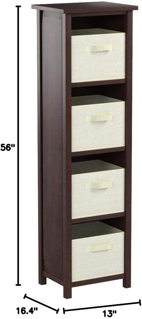 This storage shelf comes with 4 foldable beige fabric baskets. Warm Walnut finish storage shelf is perfect for any room in your home. Use it alone as bookcase/shelf or with baskets for a complete storage function. Assembly required for shelf.